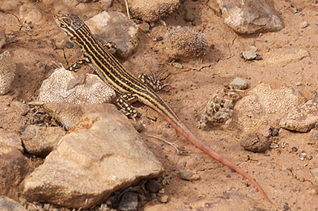 Schinz, H.R. (1833) - Description of Acanthodactylus erythrurus. - In: Naturgeschichte und Abbildungen der Reptilien. Brodtmann (Schaffhausen). 468 pp.  Harris, D.J. & Arnold, E.N. (2000) - Elucidation of the relationships of spiny-footed lizards, Acanthodactylus spp. (Reptilia: Lacertidae) using mitochondrial DNA sequence, with comments on their biogeography and evolution. - Journal of Zoology, London, 252 (3): 351-362.  ×Mitochondrial DNA sequences consisting of 645 sites from the 12S rRNA and 16S rRNA genes were used to estimate the phylogeny of 15 of the 32 species of spiny-footed lizards Acanthodactylus. The resultant tree has similarities to that produced from a differentially weighted data set of 32 morphological characters but there are also significant differences. However, combined analysis of molecular and morphological data sets produces the same tree topology as DNA sequence alone. The molecular data confirm that there are distinct eastern and western clades within Acanthodactylus, but place A. boskianus in the former while the A. scutellatus group constitutes a third clade. Species for which only morphological information is available were integrated with the combined tree to give a provisional phylogeny for 31 species. This phylogeny indicates that the ancestor of existing Acanthodactylus probably originated in south-west Asia and that North Africa was invaded by more than one lineage of the genus. It also suggests that soft aeolian sand habitats may have been independently occupied more than once. Molecular data provide independent evidence that the differential weighting of morphological characters in past analyses was appropriate. Fonseca, M.M. & Brito, J.C. & Paulo, O.S. & Carretero, M.A. & Harris, D.J. (2009) - Systematic and phylogeographical assessment of the Acanthodactylus erythrurus group (Reptilia: Lacertidae) based on phylogenetic analyses of mitochondrial and nuclear DNA - Molecular Phylogenetics and Evolution, 51 (2): 131-142.  ×We have used mitochondrial 12S rRNA, 16S rRNA and nuclear β-fibrinogen (intron 7) sequences to investigate the phylogenetic and phylogeographic relationships between Acanthodactylus erythrurus group species (except for A. boueti). The phylogenetic analyses of the Acanthodactylus genus did not cluster A. guineensis and A. savignyi with the remaining species of the group (A. blanci, A. lineomaculatus and A. erythrurus). Within the A. erythrurus group, the results of the mitochondrial DNA (mtDNA) and nuclear DNA (nDNA) showed a complex phylogeny with geographic structure, but it was not congruent with the present taxonomy. Some taxonomic units, such as A. blanci, A. lineomaculatus, A. e. atlanticus and A. e. belli did not form monophyletic genetic units. The application of a molecular clock suggested that the uplift of the Atlas Mountains in the mid-late Miocene and the reopening of the Strait of Gibraltar could be major biogeographic events responsible for the genetic differentiation in the group. Additionally, diverse micro-evolutionary patterns due to the recent contraction/expansion phases of the habitats in North Africa associated with the high dispersal capabilities of these lizards could be related to the complex phylogenetic patterns observed. Tamar, K. & Carranza, S. & Sindaco, R. & Moravec, J. & Trape, J.-F. & Meiri, S. (2016) - Out of Africa: Phylogeny and biogeography of the widespread genus Acanthodactylus (Reptilia: Lacertidae). - Molecular Phylogenetics and Evolution, 103: 6-18.  ×Acanthodactylus lizards are among the most diverse and widespread diurnal reptiles in the arid regions spanning from North Africa across to western India. Acanthodactylus constitutes the most species-rich genus in the family Lacertidae, with over 40 recognized species inhabiting a wide variety of dry habitats. The genus has seldom undergone taxonomic revisions, and although there are a number of described species and species-groups, their boundaries as well as their interspecific relationships are largely unresolved. We constructed a multilocus phylogeny, combining data from two mitochondrial (12S, cytb) and three nuclear (MC1R, ACM4, c-mos) markers for 302 individuals belonging to 36 known species, providing the first large-scale time-calibrated molecular phylogeny of the genus. We evaluated phylogenetic relationships between and within species-groups, and assessed Acanthodactylus biogeography across its known range. Acanthodactylus cladogenesis is estimated to have originated in Africa due to vicariance and dispersal events from the Oligocene onwards. Radiation started with the separation into three clades: the Western and scutellatus clades largely distributed in North Africa, and the Eastern clade occurring mostly from Arabia to south-west Asia. Most Acanthodactylus species diverged during the Miocene, possibly as a result of regional geological instability and climatic changes. We support most of the current taxonomic classifications and phylogenetic relationships, and provide genetic validity for most species. We reveal a new distinct blanfordii species-group, suggest new phylogenetic positions (A. hardyi, A. masirae), and synonymize several species and subspecies (A. lineomaculatus, A. boskianus khattensis and A. b. nigeriensis) with their phylogenetically closely-related species. We recommend a thorough systematic revision of taxa exhibiting high levels of intraspecific variability as well as clear evidence of phylogenetic complexity such as A. guineensis, A. grandis, A. dumerilii, and A. senegalensis and the pardalis and erythrurus species-groups.